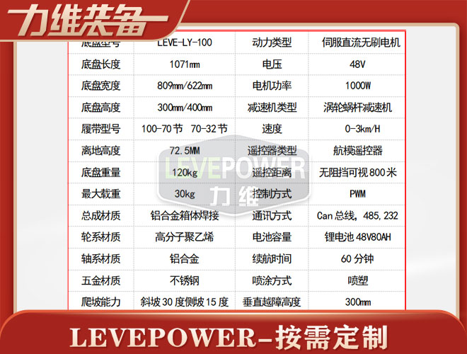 特種橡膠履帶底盤長1071mm,履帶底盤寬809mm,履帶底盤高300mm,無線遙履帶底盤搭載48V1KW直流無刷永磁電機,RV50渦輪蝸桿減速機,動力更強。履帶底盤采用48V80AH鋰電池,續(xù)航時間更長。四驅履帶越野底盤,動力更強。爬樓履帶機器人底盤,前后擺臂設計,不僅外觀漂亮,越野性能更強,爬樓性能更穩(wěn)定。履帶底盤框架采用鋁合金箱體焊接而成,底盤承載力大,是一款全地形履帶底盤。
