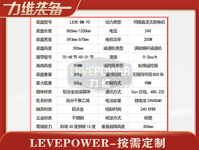 該底盤主體履帶使用100mm寬耐磨橡膠履帶,外花紋橫紋設(shè)計,提高攀爬能力。擺臂履帶采用40mm寬度機(jī)器人橡膠履帶,底盤箱體經(jīng)過高溫噴砂噴塑防銹處理,主題底盤采用2個24v200w伺服直流無刷電機(jī),擺臂采用1個24v200w伺服直流無刷電機(jī),渦輪蝸桿減速機(jī),可載重50kg,是一種操控既方便,有實(shí)用的底盤系統(tǒng),在不平坦的路面,爬坡,越障非常好用。是一款全地形底盤。電池采用24v45ah磷酸鐵鋰鋰電池,持續(xù)續(xù)航時間可達(dá)4個小時長時間續(xù)航。